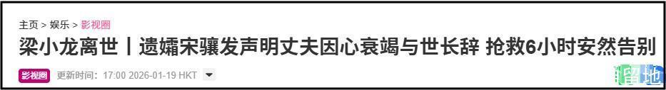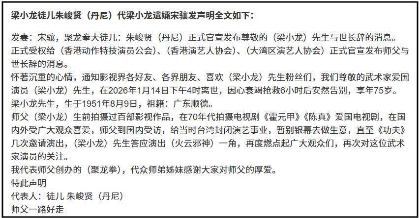 根据声明可知,梁小龙因心衰竭抢救6小时,于1月14日下午4时离世,享年75岁。