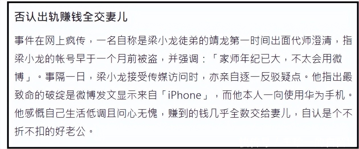 梁小龙还说自己生活低调,问心无愧,自己所赚的钱几乎全部交给妻儿,自认是个不折不扣的好老公。