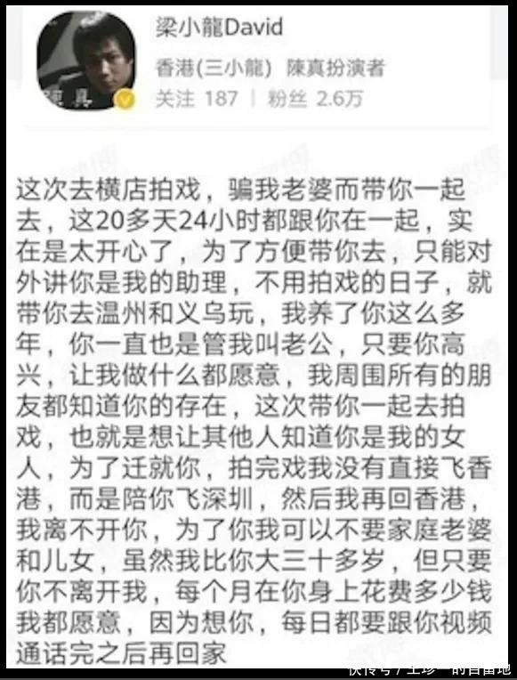 文中梁小龙还向女方表白,直言“我离不开你,为了你我可以不要家庭,老婆和儿女。虽然我比你大三十多岁,但只要你不离开我,每个月在你身上花费多少钱我都愿意。因为想你,每日都要跟你视频,通完话之后再回家”。