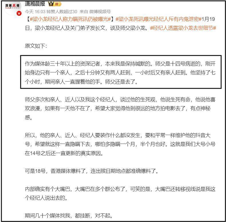 1月19日一大早,梁小龙的经纪人发文谴责了泄露梁小龙去世消息的人,并透露了梁小龙去世的细节。